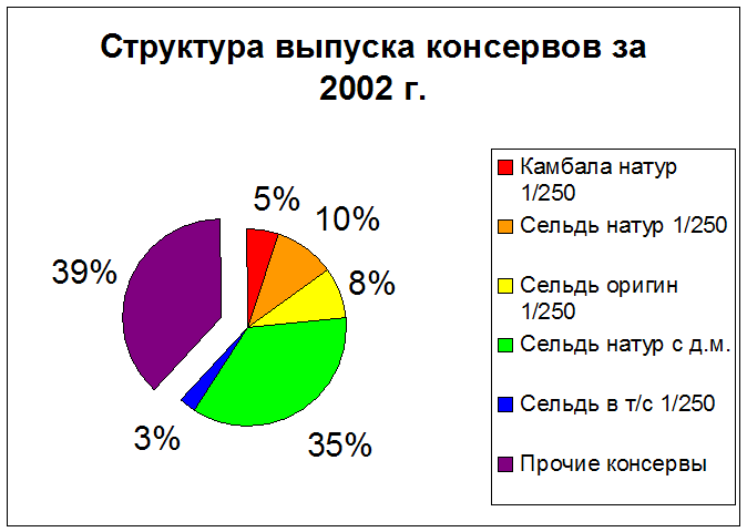 Как следует из табл. 2.1. наибольший удельный вес в 2001 году занимает сельдь натуральная, выпуск составил 54,41% в общем объеме, а в 2002 году сельдь натуральная с добавлением масла 35,21%. Это изменение произошло в связи с тем, что спрос на сельдь с добавлением масла больше. Структура сельди в томатном соусе резко сократилась на 4,38% (82 991 банок), это также связано с рыночным спросом. По другим видам сельди показатели доли структуры в общем объеме выпуска доходят до 10%. Следовательно, влияние приведенных пяти видов консервной продукции в выпуске консервной продукции существенное. Таблица 2.2 – Выпуск основных видов консервной продукции ОАО «ВРК» за 2001 и 2002 год