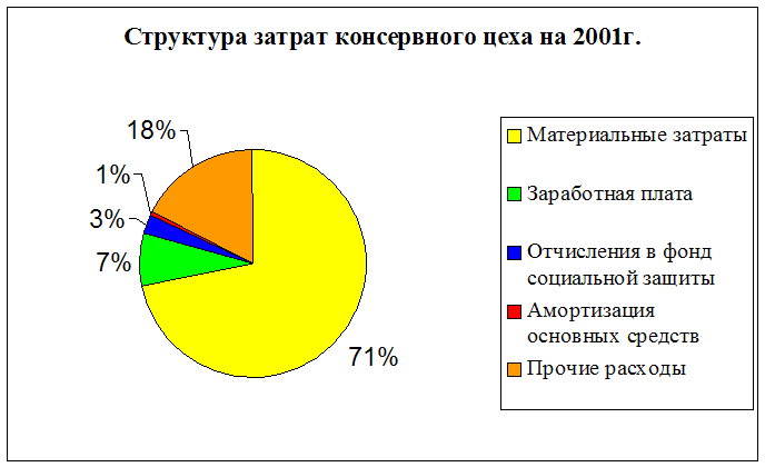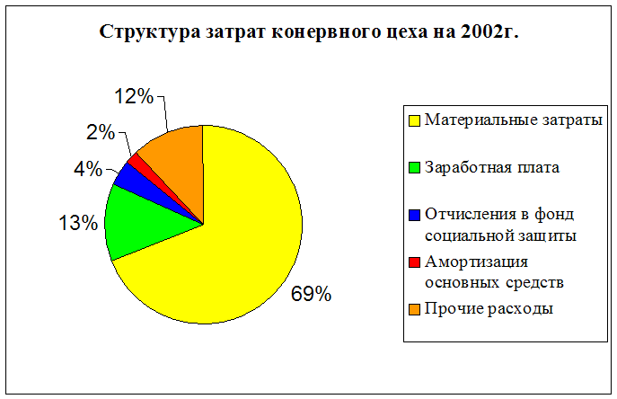 Из данных таблицы хорошо видно, что из пяти элементов затрат высокую долю занимают материальные затраты. Их структура в полной себестоимости в 2001 г. составила 71,73%, а в 2002 г. 69,01%. Вследствие этого можно утверждать, что именно материальные затраты являются основным элементом формирования себестоимости консервного цеха рыбокомбината. Снижение доли материальных затрат может означать то, что рыбокомбинат в 2002 г. в общем по консервному цеху использовал более дешевое сырье. Но этот вопрос мы рассмотрим далее. Общая сумма материальных затрат за 2002г. составляет около 25 миллионов рублей, а отклонение с 2001 г. по 2002 г. составило почти 8 миллионов рублей в сторону увеличения. Данный показатель вырос в связи с увеличением объема производства по консервному цеху. Удельный вес заработной платы в структуре составляет 7,38% в 2001 г. и 12,65% в 2002г. Рост заработной платы по консервному цеху и повышение материальных затрат за 2002 г. говорит о том, что объемы производства увеличились за год, так как заработная плата персонала цеха зависит от сделанной работы. Рост этого показателя в структуре составил 5,27% или 2 810 323,05 руб. за 1 год. Отчисления в фонд социальной защиты начисляется от заработной платы. Следовательно, с ростом заработной платы в 2002 году выросли и отчисления. При росте заработной платы на три миллиона рублей, рост отчислений составил почти один миллион рублей. Это и следовало ожидать, так как существует следующая зависимость 1/3. Это связано с тем, что отчисления в фонд социальной защиты происходит из фонда заработной платы в размере 36,7%, но данный процент отчислений варьируют в зависимости от льгот распространяющихся на работников цеха. Удельный вес отчислений в фонд социальной защиты в общей структуре себестоимости небольшой 2,71% в 2001г и 4,29% в 2002г. Как выяснилось, изменение данного показателя произошли из-за роста заработной платы. Элемент «Амортизация основных средств» занимает небольшое удельное место в структуре себестоимости. В 2001 г. 0,6% и в 2002 г. 2,1%. Скачок за один год составил 1,5%. Это произошло за счет изменения политики начисления амортизации на консервную продукцию руководством предприятия и пополнением цеха нового оборудования (автоклавов). В 2001 г. сумма отчислений составляла 1 38 215 руб., а в 2002 г. 756 854 руб., что на 618 639 руб. больше (почти в шесть раз). Изменение по «Прочим расходам» за один год составило 151 526 руб. Это самое небольшое изменение, которое произошло из всех элементов затрат. Прочие расходы занимают второе место в структуре себестоимости после материальных затрат. В 2001г. их доля была 17,58%, а в 2002г. 11,93%. Высокую долю в прочих расходах занимает кредиторская задолженность и проценты по кредитам. Снижения показателя произошло на 5,65%, это связано с тем, что предприятие вернуло часть кредиторской задолженности. В итоге под влиянием роста всех элементов затрат, увеличилась и полная себестоимость консервной продукции за год на 12 404 548 руб. Это связано с увеличением объема производства консервного цеха. Этот фактор был причиной повышения по всем элементам затрат и, прежде всего, материальным затратам и заработной плате. Данные о постоянных и переменных затратах показывают, что в структуре себестоимости консервной продукции в 2001 г. переменные затраты занимали 84,36%, а в 2002 г. 78,58%, изменение за составило 5,7%, а в денежном выражении переменные затр