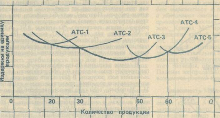 График 1.1. Кривая долгосрочных средних издержек: пять возможных размеров предприятия больше и больше расширялось. Что будет происходить со средними общими издержками в процессе этого роста предприятия? Ответ таков. Сначала какое-то время расширение производственных мощностей будет сопровождаться снижением средних общих издержек. Однако, в конце концов ввод все больших и больших мощностей приведет к росту АТС. На графике эта закономерность проиллюстрирована применительно к пяти различным размерам предприятия. Кривая АТС-1 показывает динамику средних общих издержек для самого маленького из пяти предприятий, кривая АТС-5 — для самого большого. Соотношение между этими пятью кривыми в точности соответствует изложенному выше правилу. Строительство все более крупных предприятий будет приводить к снижению минимальных издержек на производство единицы продукции вплоть до достижения размеров третье предприятия. Однако за этим пределом расширен производственных мощностей будет означать повышение минимального уровня средних общих издержек. Принципиальное значение имеют тонкие лини перпендикулярные горизонтальной оси. Они показывают те объемы производства, при которых фирме следует изменить размер предприятия, чтобы обеспечить себе возможно более низкие издержки производства единицы продукции. Посмотрим на рисунок. При любом объеме производства меньше 20 единиц минимальные издержки производства единицы продукции достигаются на предприятии. Однако если объем продаж фирмы превышает 20 единиц, но меньше 30 единиц, она сможет добиться более низких издержек производства, построив более крупное предприятие — предприятие 2. Несмотря на то что сумма общих издержек при больших масштабах производства будет большей, издержки производства единицы продукции окажутся ниже, чем прежде. При любых объемах производства в промежутке от 30 до 50 единиц наименьшие издержки производства единицы продукции обеспечит предприятие 3. При объеме производства от 50 до 60 единиц для достижения наименьших издержек следует строить предприятие 4. А при объеме производства, превышающем 60 единиц, достижение той же цели требует строительства предприятия 5. Наблюдая за этими приспособительными изменениями, можно заключить, что кривая долгосрочных АТС для отдельной фирмы состоит из участка кривых краткосрочных АТС применительно к различным размерам тех предприятий, которые могут быть построены. Кривая долгосрочных средних общих издержек (АТС) показывает наименьшие издержки производства единицы продукции, с которыми может быть обеспечен любой объем производства при условии, что фирма имела в свое распоряжении достаточно времени для проведения всех необходимых изменений в размерах предприятия. На графике жирной линией показана кривая долгосрочных АТС фирмы или как ее часто называют, кривая выбора (или плановая кривая) фирмы. Для большинства видов производства возможности выбора размеров предприятия куда шире, чем мы предположили в нашем примере. Фактически во многих отраслях количество возможных paзмеров предприятия совершенно не ограничено. А это значит, что самые малые изменения в объеме выпускаемой продукции (в объеме продаж) со временем подталкивают к соответствующим изменениям в размерах предприятия. В следующей главе мы рассмотрим подр