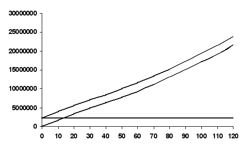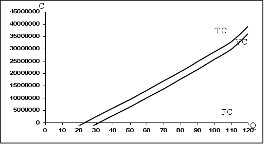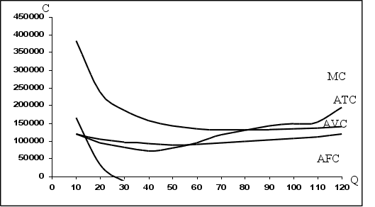 Можно заметить, что предельные издержки сначала резко снизились, а потом постепенно стали возрастать, достигая максимального значения 244537,5 при объеме производства 120 млн. флаконов. Теперь изобразим графически взаимосвязь общих, средних и предельных издержек с объемом производства (график 2.1.) на 1999 год.
