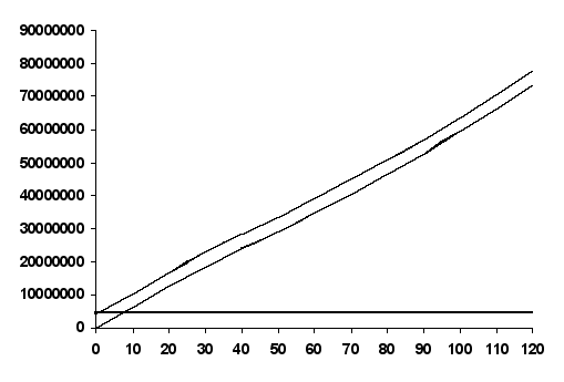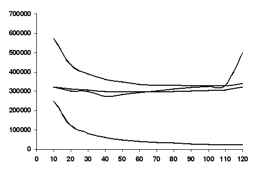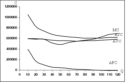 Следует отметить, что средние постоянные издержки сначала падают, достигая своего минимального значения 50022,95 при объеме производства 20 млн. флаконов, а затем начинают расти, достигая максимального значения 181211,2 при объеме производства 120 млн. флаконов.