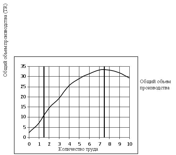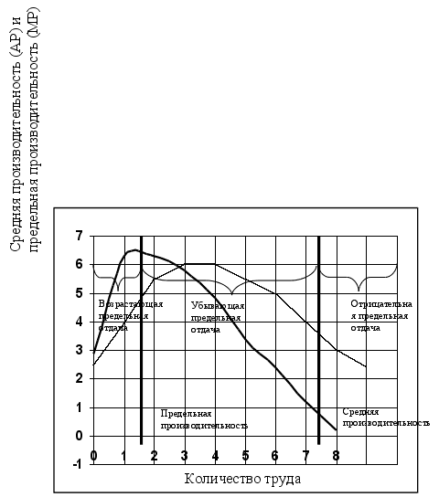Издержки производства какого-либо продукта данной фирмой зависят не только от цен необходимых ресурсов, но и от технологии — от количества ресурсов, которое необходимо для производства. Именно это, то есть технологический аспект формирования издержек, и интересует нас в данный момент. В течение краткосрочного периода фирма может изменить объем производства путем соединения изменяющегося количества ресурсов с фиксированными мощностями. Вопрос: каким образом будет изменяться объем производства, по мере того как все большее и большее количество переменных ресурсов будет присоединяться к фиксированным ресурсам фирмы? [ 9, c. 321]. В самой общей форме ответ на этот вопрос дает закон убывающей отдачи, который также называется "законом убывающего предельного продукта", или "законом изменяющихся пропорций". Этот закон утверждает, что, начинам с определенного момента, последовательное присоединение единиц переменного ресурса (например, труда) к неизменному, фиксированному ресурсу (например, капиталу или земле) дает уменьшающийся добавочный, или предельный, продукт в расчете на каждую последующую единицу переменного ресурса. Иначе говоря, если количество рабочих, обслуживающих данное машинное оборудование, будет увеличиваться, то рост объема производства будет происходить все медленнее, по мере того, как больше рабочих будет привлекаться к производству [ 19, c. 383]. Для иллюстрации этого закона приведем логическое объяснение. Представьте, что фермер имеет фиксированное количество земли — скажем, 80 га, — на которой выращиваются зерновые. При предположении, что фермер вовсе не занимается культивацией почвы, урожай с его полей составит, например, 40 ц с одного га. Если почва будет обработана один раз, урожай может подняться до 50 бушелей с акра. Вторая обработка может увеличить урожай до 57 ц. с га, третья — до 61, а четвертая, скажем, до 63. Дальнейшая же обработка почвы принесет лишь очень малую или даже нулевую прибавку к урожаю. Последующая обработка вносит все меньший и меньший вклад в продуктивность земли. Если бы дело обстояло иначе, мировые потребности в зерне могли бы быть удовлетворены путем исключительно интенсивной обработки одного только этого, восьмидесятигектарного участка земли. Действительно, если бы не происходило убывающей отдачи, весь свет можно было бы накормить урожаем из одного цветочного горшка . Закон убывающей отдачи применим также и к несельскохозяйственным отраслям. Например, АООТ «Биохимик» цех №3 изготавливает препарат ампициллина натриевая соль. В цехе имеется определенное количество оборудования — токарных и строгальных станков, пил и т.п. Если бы эта фирма наняла всего одного или двух рабочих, общий объем производства и уровень производительности (в расчете на одного работника) оказались бы очень низкими. Этим рабочим пришлось бы выполнять целый ряд различных трудовых операций, а преимущества специализации не смогли бы быть реализованы. Кроме того, рабочее время терялось бы всякий раз при переходе рабочего от одной операции к другой, а машины значительную часть времени стояли бы без дела. Короче, цех оказался бы недоукомплектованным рабочими, а производство, следовательно, было бы неэффективным. Производство было бы неэффективным по причине избытка капитала по сравнению с трудом. Эти затруднения ис