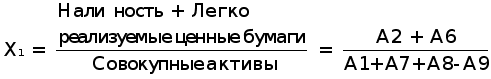Коэффициент текущей ликвидности предполагает сопоставление текущих активов, т.е. средств, которыми располагает клиент в различной форме (денежные средства, дебиторская задолженность нетто ближайших сроков погашения, стоимости запасов товарно-материальных ценностей и прочих активов), с текущими пассивами, т.е. обязательствами ближайших сроков погашения (ссуды, долг поставщикам, по векселям, бюджету, рабочим и служащим). Если долговые обязательства превышают средства клиента, последний является некредитоспособным. Из этого вытекают и приведенные нормативные уровни коэффициента. Значение коэффициента, как правило, не должно быть менее 1. Исключение допускается только для клиентов банка с очень быстрой оборачиваемостью капитала. Излишек ликвидных средств — также нежелательное явление, его наличие может быть свидетельством недостаточно эффективного использования заемщиком временно свободных денежных средств и других дорогостоящих оборотных активов. Считается, что оптимальная потребность предприятия в ликвидных средствах должна находиться на уровне, примерно в два раза превышающем краткосрочную задолженность (хотя при высокой оборачиваемости оборотных средств эта потребности может быть значительно меньше двух и находиться на уровне единицы). Довольно часто в практике российских и зарубежных коммерческих банков вместо коэффициента текущей ликвидности вычисляется коэффициент ликвидности, определяемый как отношение быстрореализуемых активов к текущим обязательствам, что в целом предполагает более объективную оценку ликвидности баланса. Однако при этим остается неопределенный способ выделения самой быстрореализуемой части активов. Американские коммерческие банки называют коэффициентом ликвидности соотношение наиболее ликвидных активов и краткосрочных долговых обязательств. При этом в понятие наиболее ликвидных активов вкладываются: денежная наличность и дебиторская задолженность краткосрочного характера. В состав краткосрочных долговых обязательств включается задолженность по ссудам краткосрочного характера, векселям, неоплаченным требованиям и прочим краткосрочным обязательствам. Таким образом, предыдущий показатель несколько конкретизирует следующая формула: Этот коэффициент иначе называется как коэффициент срочной ликвидности. Срочный коэффициент ликвидности исчисляется исходя из денежных средств и краткосрочных финансовых вложений (быстрореализуемых ценных бумаг). Оптимальная величина данного показателя должна быть примерно 0,25-0,35. Коэффициент абсолютной ликвидности является наиболее жестким критерием ликвидности предприятия, показывая какая часть краткосрочных заемных средств обязательств может быть погашена немедленно (оптимальное значение этого показателя колеблется около 0,2). При необходимости оценивать и контролировать ликвидность каждого элемента мобильных средств можно воспользоваться следующим методом структуризации коэффициента ликвидности. Статьи нетто-баланса распределяются на группы: в активе — по степени ликвидности средств; в пассиве — по степени срочности подлежащих оплате обязательств. Активы предприятия в зависимости от скорости превращения их в деньги делятся на четыре группы. Наиболее ликвидные активы А1. В эту группу входят денежные средства и