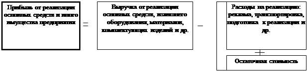 Рис 1. Прибыль предприятия от реализации продукции (работ, услуг) Выручка принимается в расчет без НДС и акцизов, которые, являясь косвенными налогами, поступают в бюджет. Из выручки также исключается сумма наценок (скидок), поступающая торговым и снабженческо-сбытовым предприятиям, участвующем в сбыте продукции. Предприятия, экспортирующие продукцию, исключают экспортные тарифы, направляемые в доход государства. При этом денежные поступления, связанные с выбытием основных средств, материальных (оборотных) и нематериальных активов, продажная стоимость валютных ценностей, ценных бумаг не включаются в состав выручки. Состав затрат на производство и реализацию продукции (работ, услуг), включают в себестоимость, регламентируется законодательно («Положения о составе затрат…» №552, с последующими изменениями и дополнениями). Затраты, образующие себестоимость, группируются по следующим элементам: материальные затраты, затраты на оплату труда, отчисления на социальные нужды, амортизация основных фондов и прочие. По реализации продукции, имеющей натурально-вещественную форму, расчет прибыли ведется исходя из выручки и полной себестоимости продукции, определяемыми на объем реализуемой продукции. В натуральном выражении он включает остатки готовой продукции на начало отчетного периода, не реализованные в прошлом периоде, и выпуск товарной продукции отчетного периода за минусом той части продукции, которая не может быть реализована в конце отчетного периода. Под периодом понимается квартал или год. Состав остатков нереализованной продукции на начало и конец периода зависит от избранного предприятием метода учета выручки – по поступлению денег на расчетный счет (в кассу) предприятия или по отгрузке продукции, расчетные документы по которой предъявлены покупателю. Прибыль от выполнения работ и оказания услуг рассчитывается аналогично прибыли от реализации продукции. Прибыль (убыток) от реализации основных средств, их прочего выбытия, реализации имущества предприятия – это финансовый результат, не связанный с основными видами деятельности предприятия (рис. 2). Он отражает прибыль (убытки) от прочей реализации, к которой относится продажа на сторону различных видов имущества, числящегося на балансе предприятия.