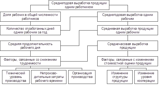 Величина среднегодовой выработки продукции одним работником зависит не только от среднечасовой выработки рабочих, но и от удельного веса рабочих, а так же от количества отработанных ими дней и продолжительности рабочего дня. Отсюда среднегодовую выработку продукции одним работником можно представить в виде произведения следующих факторов: