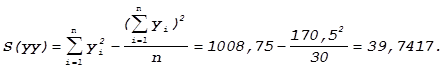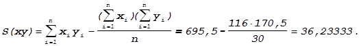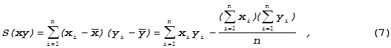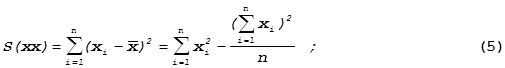 где n – число пар данных; S(xy) называется ковариацией; x и y – два исследуемых показателями. Коэффициент корреляции может принимать значения от –1 до +1. При r, близком к │1│, можно говорить о высокой степени тесноты связи между исследуемыми переменными и напротив: при r, близком к 0, корреляция между ними выражена слабо. Если r = │1│, все точки на диаграмме рассеивания будут лежать на одной прямой. Если же r = 0, корреляционная связь между факторным и результативным показателями отсутствует. Знак «+» или «–» говорит о направлении связи – прямом или обратном. По формулам (4) – (7) и данным табл. 1 можно найти коэффициент корреляции. Дополнительные необходимые расчеты приведены в табл. 5. Тогда, подставив полученные значения, будем иметь:
