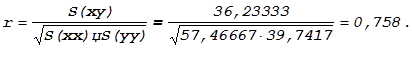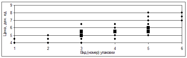 Значение r, равное +0,758, свидетельствует о наличии высокой положительной корреляции между упаковкой товара, являющейся одним из показателей его качества, и ценой на него, в которой воплощены затраты на товар, что подтверждает предварительный вывод, сделанный по диаграмме рассеивания. Таблица 5 Показатели для расчета коэффициента корреляции