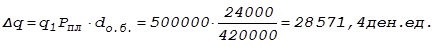 Из табл. 7 можно сделать вывод, что основной причиной брака явилась поставка некачественного сырья или иных видов материальных ресурсов. В отчетном году, основываясь на опыте предыдущего периода, производитель составил договор на поставку материалов, предусматривающий компенсацию в случае их низкого качества, которая и позволила сократить абсолютный размер потерь от брака на 9 300 ден. ед. (24 000 – 14 700) или на 38,75% (14 700 / 24 000 · 100%). Относительный размер потерь от брака снизился на 2,5%. Можно также определить стоимость годной продукции, которая могла бы быть получена при отсутствии брака (∆q). Для этого следует фактический объем товарной продукции в плановых ценах (q1Pпл) умножить на долю окончательного брака производственной себестоимости (dо.б.).
