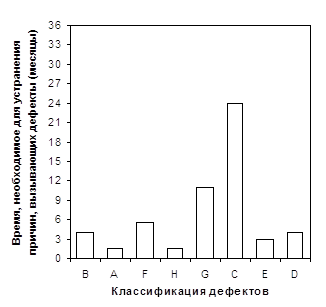 Пусть для нашего примера q1Pпл = 500 000 ден. ед. Тогда Менеджеры должны рекомендовать руководству фирмы найти предприятие, поставляющее более качественное сырье для данного производства. Анализ брака, обнаруженного на предприятии, и анализ рекламаций следует начинать с изучения причин их возникновения. Это позволит более точно определить размер израсходованных средств и пути снижения затрат на обеспечение качества продукции. Однако затраты, связанные с решением проблем по возникновению, предотвращению брака, иногда могут превышать затраты, которое несет предприятие, если брак не устранен. Для этого следует тщательно проанализировать затраты на предотвращение различных дефектов и их устранение. В этом могут помочь кривая Парето и дополнительные графики, отражающие издержки, связанные с этими дефектами, оценки издержек, связанных с решением проблем, и оценки времени, требующегося для решения проблем. На рис. 4 определяется дефект, приводящий к наибольшему числу отказов, но