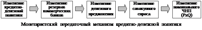 Фиксируя в качестве исходного положения экономической системы точку Е2 (рынок денег), центральный банк пересматривает тактическую цель своей денежно-кредитной политики и уменьшает количество денег в обращении. Графически это можно интерпретировать в виде сдвига кривой предложения денег влево. Растущая норма процента вызывает сокращение объема плановых инвестиций. Оно с свою очередь, сдвигает кривую совокупного спроса влево, заставляя снижаться уровни цен и реального объема производства. Это означает уменьшение величины номинального дохода, что заставляет кривую спроса на деньги также сдвинуться влево, но не настолько, чтобы избежать некоторого повышения нормы процента. Новое равновесие на краткосрочном временном интервале устанавливается тогда, когда рынок денег возвращается в состояние Е1, а экономическая система в целом вновь оказывается в точке е1. Подводя итоги, можно сказать, что на краткосрочных временных интервалах последствия ограничительных действий в рамках денежно-кредитной политики состоят в следующем: 1. Повышение нормы процента. 2. Уменьшение уровня реального объема производства. 3. Понижение уровня цен. Обратившись к политике дорогих денег для ограничения инфляции , мы обнаружим, что чистый экспорт сократиться. Это означает рост торгового дефицита. (Проблема: инфляция à политика дорогих денег – более высокая процентная ставка – à возросший спрос на национальную валюту за границей à стоимость национальной валюты повышается à чистый экспорт сокращается–сокращается совокупный спрос). Следовательно, политика дорогих денег, проводимая для смягчения инфляции, противоречит задаче корректировке дефицита торгового баланса. 2.3 Монетаризм Монетаристский подход состоит в том, что рынки в достаточной мере конкурентны и что система рыночной конкуренции обеспечивает высокую степень макроэкономической стабильности. Таким образом, рыночная система, если она не подвергается государственному вмешательству в функционирование экономики, обеспечивает значительную макроэкономическую стабильность. Монетаристы являются ярыми сторонниками свободного рынка. Государственное управление считается неэффективным, вредным для индивидуальной инициативы и содержащим нередко политические ошибки, которые дестабилизируют экономику. Основополагающим уравнением монетаризма является уравнение обмена: MV = PQ,где М – предложение денег, V – скорость обращения денег в кругообороте доходов; P – уровень цен или, точнее, средняя цена, по которой продается каждая единица физического объема производства; Q – физический объем производимых товаров и услуг. Монетаристы видят в денежном предложении единственный фактор, определяющий уровень производства, занятости и цен. Теоретические рассуждения монетаристов проистекают из того, что расширение денежного предложения повышает спрос на все виды активов, а также на текущий объем производства. Следовательно, в условиях полной занятости цены на все факторы возрастут. Кроме того, монетаристы считают скорость обращения денег стабильной – в том смысле, что ее колебания невелики и она не изменяется в ответ на изменение самого по себе денежного предложения. Значит, изменения денежного предложения оказывает предсказуемое воздействие на уровень номинального ЧНП (=PQ).