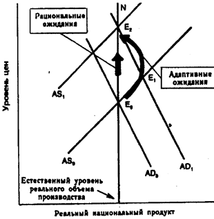 С точки зрения монетаристов, изменение совокупного спроса влияет преимущественно на уровень цен и оказывает слабое воздействие на реальный ВНП. Данный вывод следует из предположения, что если Центральный банк придерживается монетарного правила, то объем производства в экономике все время находится на уровне почти полной занятости. Если те, кто делают политику, попытаются использовать стабилизационные меры, их усилия окажутся напрасными. В результате смещения кривой совокупного спроса с AD1 к AD2 мы получаем скромный рост реального объема производства, но значительный рост уровня цен. За очень скромное увеличение объема производства и занятости экономика платит высокую цену в виде инфляции. 2.4 Гипотеза естественного уровня Гипотеза естественного уровня ставит под вопрос само существование нисходящей кривой Филлипса в том виде, в котором она изображена на рисунке 3. Этот подход дает вывод, что экономика является устойчивой в долгосрочном плане при естественном уровне безработицы. В соответствии с гипотезой естественного уровня, неправильно ориентированная кейнсианская политика полной занятости, исходящая из тезиса о существовании кривой Филлипса, приведет к росту уровня инфляции. В соответствии с гипотезой естественного уровня, всякий данный уровень безработицы совместим с естественным уровнем безработицы в экономике. Гипотеза естественного уровня имеет два варианта – это теория адаптивных и теория рациональных ожиданий. 2.4.1 Теория адаптивных ожиданий Наиболее упрощенный вариант теории адаптивных ожиданий сводится к тому, что люди представляют себе будущее подобно недавнему прошлому, отталкиваясь от которого они формируют свои планы, то есть фирмы ожидает в настоящем году тот же самый темп инфляции, что и в прошлом году. В более сложных экономических моделях нередко предполагается, что ожидания основаны на некоем средневзвешенном значении темпов инфляции за несколько предыдущих лет. Однако все эти предположения суть не что иное как вариации на одну и ту же тему: генералы всегда готовятся к прошедшей войне. Теория адаптивных ожиданий в своей основе предполагает использование кривой совокупного предложения, имеющей положительный наклон на краткосрочных временных интервалах и перемещающейся вверх на долгосрочных интервалах. Таким образом, теория адаптивных ожиданий создает основу для вполне удовлетворительной интерпретации процесса инфляции. Однако по ряду причин эта теория не удовлетворяет многих экономистов. 2.4.2 Теория рациональных ожиданий Концепция рациональных ожиданий является одним из самых молодых направлений современной экономической теории. Вследствие использования методологических принципов классической экономики теория рациональных ожиданий получила также название «новая классическая экономика». Одна из центральных идей неоклассиков состоит в том, что экономические агенты, используя информацию, в состоянии самостоятельно прогнозировать экономические процессы и принимать оптимальные решения. На основе доступной информации экономические агенты принимают решения о текущем и перспективном потреблении, исходя из прогнозов относительно будущего уровня цен на предметы потребления. При этом потребители стремятся к максимизации полезности. Другим основным положением ТРО являет