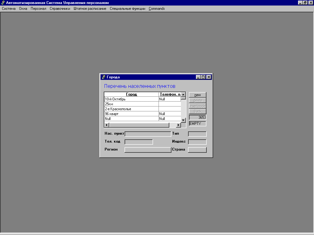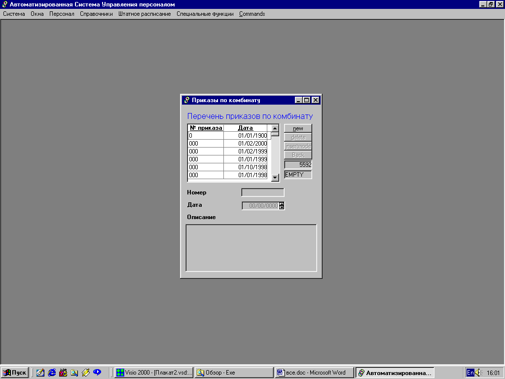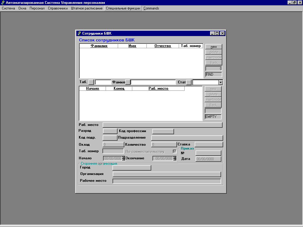 3.3.Руководство оператора 3.3.1.Общие положения Для начала работы с “АСУ персоналом” необходимо запустить средствами ОС на выполнение программу системы - файл “personal.exe”. Режим интегрированной среды предусматривает участие человека (оператора) на всех стадиях обработки информации. Обработка информации осуществляется путем диалогового взаимодействия оператора с программой системы. Обработка информации в режиме интегрированной среды сводится к выполнению функций, предусмотренных в меню программы системы. Приведем общие функции, которые выполняются во всех рабочих формах данного комплекса. Поиск. Для того чтобы осуществить поиск, по каким либо значениям, для этого необходимо: