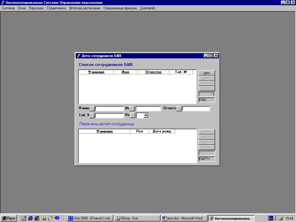 Рис 3.1. Экранная форма «персонал» Работа с каждой таблицей по отдельности происходит при выборе остальных рабочих форм например: