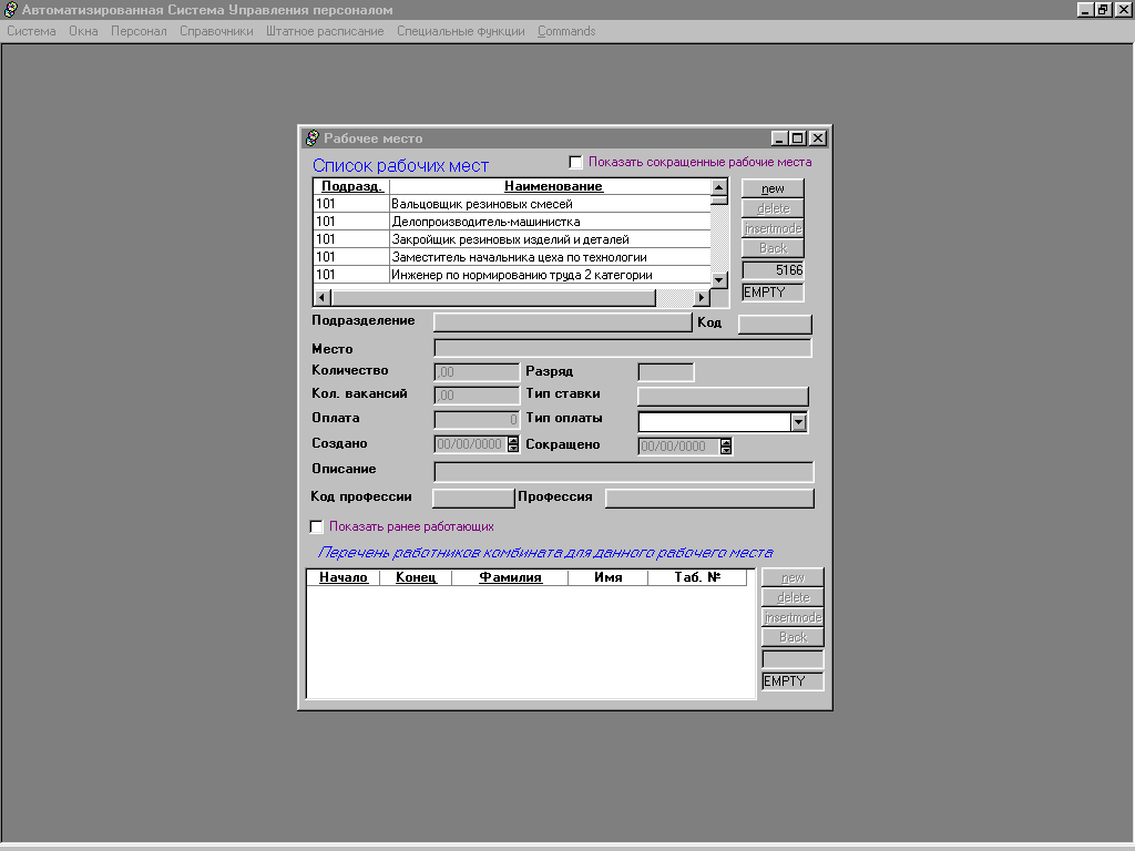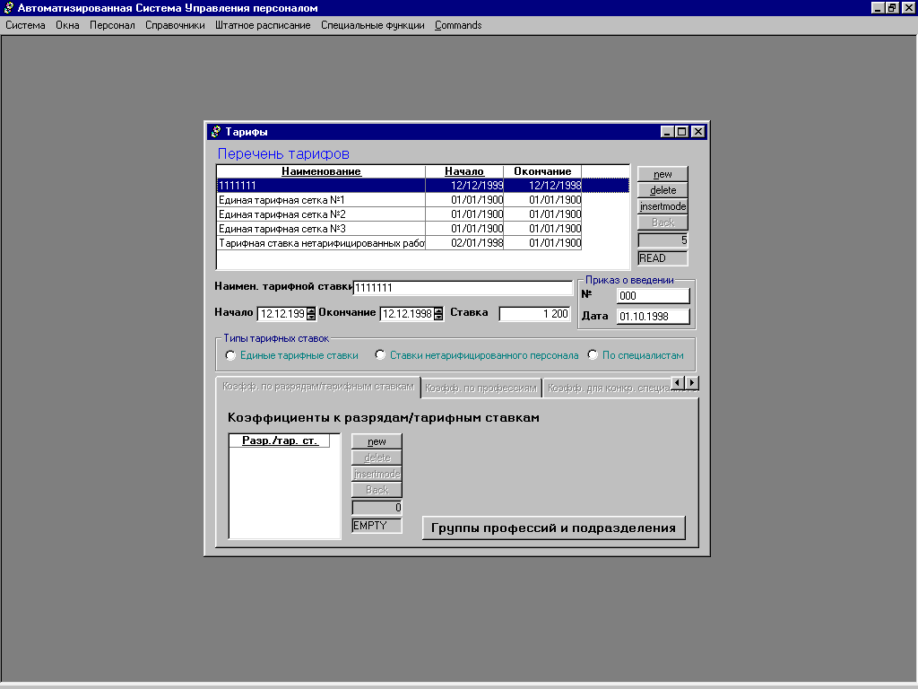 Рис 3.8. Пример одного из справочников 3.3.4 Пункт меню «Штатное расписание». Данный пункт меню создавался для нужд бухгалтерии. В данном пункте меню имеется возможность изменить различные типы ставок, оплат, а также коэффициентов, которые установлены для определенных рабочих мест, различная работа с тарифами, здесь же заносятся приказы о добавлении новых тарифов, вводятся новые коэффициенты к тарифным ставкам и разрядам. Предусмотрено изменение и добавление данных как это указанно в пункте 3.3.1.
