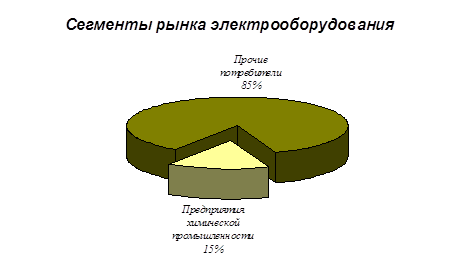 РЫНКИ СБЫТА. Маркетинговые исследования показали, что рынок электрооборудования состоит из различных сегментов. Специфика выпускаемой нами продукции (СГД) состоит в том, что эти двигатели лучше всего использовать при работе с высоко инерционной нагрузкой. Это становится возможным благодаря уникальным свойствам механической характеристики двигателя. Работа с высоко инерционной нагрузкой наиболее характерна для предприятий химической промышленности, которые составляют 15 % от общей емкости рынка.