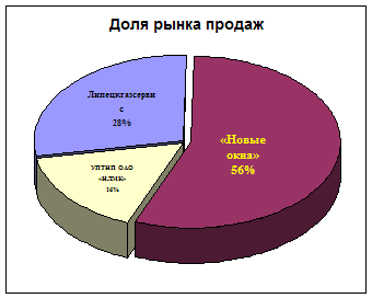 Согласно проведенному исследованию доли рынка продаж распределились следующим образом (См. рис.): - Фирма «Новые окна» - 56% рынка; - ОАО "Липецкгазсервис" – 28%; - УПТНП ОАО «НЛМК» - 16%. Сравнительная оценка фирм-конкурентов представлена в таб. 3 Таблица 3 Сравнительные характеристики фирм-конкурентов.