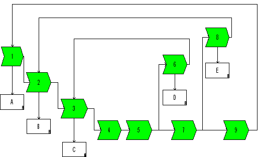 Рис. 11. Модель контура контроллинга1 Блок 1 – укрупненная функция формирования долгосрочного плана предприятия на год. В данном случае можно рассматривать как технико-экономическое, так и финансовое планирование. По итогам выполнения функций блока 1 появляется совокупность документов (блок А), представляющая собой комплексный план в текстовой и электронной форме. При формировании этого плана используются укрупненные показатели. Годовой план формируется в разбивке по кварталам. Далее план первого квартала детализируется месячные планы (блок 2) и первый месячный план детализируется по неделям (блок 3). На выходе этих блоков получаем соответственно квартальные (блок В) и месячные (блок С) планы. Блок 4 – объединяет в себе функции оперативного учета (ежедневный, еженедельный) и контроля. Именно в этом блоке описываются функции по направлениям оперативного учета. Блок 4 является базовым при описании процессов управленческого учета. На основе данных оперативного учета проводится контроль и осуществляется оперативное управление. В блоке 5 описаны функции ежемесячного учета. Это уже бухгалтерские функции. Связь между блоками 4 и 5 собственно должна обеспечивать адекватный перенос данных из регистров оперативного учета в регистры бухгалтерского учета. На этапе блока 6 производится корректировка следующего месячного плана по итогам выполнения плана истекшего месяца. Таким образом, внутренний цикл месячного планирования и контроля замыкается. Аналогично ведет себя процесс квартального учета и контроля (блоки 7 и 8, блок Е). Наконец, по итогам года проводится контроль и анализ выполнения годового плана по всем направлениям и критериям достижения стратегических целей. На следующем этапе ведения проекта, укрупненные блоки верхнего уровня детализируются при помощи декомпозиции на более низкий уровень. Формируются детальные модели бизнес-процессов планирования, оперативного и бухгалтерского учета, анализа и контроля, управления. По ходу описания процессов в модель заносится информация по выполняемым в различных отделах операциях, требуемых для этого документах. Документы детализируются в разрезе показателей. За формирование, учет и контроль каждого из них отвечает определенный сотрудник предприятия. В итоге мы получаем комплексную модель планирования и контроля деятельности предприятия, детально описанную при помощи инструментальной среды моделирования ARIS Toolset. Созданные модели обязательно документируются в виде текстовых отчетов, которые затем используются при внедрении разработанных процессов. При этом изменяются полномочия и ответственность сотрудников, разрабатываются (изменяются) должностные инструкции, утверждаются типовые формы плановых и отчетных документов, внедряется система документооборота. Экономический эффект от внедрения подобной системы проявляется по следующим направлениям: увеличение объема сбыта (25-30%), сокращение производственных и непроизводственных затрат (15-25%), увеличение оборачиваемости ресурсов (2-5 раз), сокращение затрат на закупку ресурсов (10-20%), рациональное расходование средств на капитальное строительство и техническое перевооружение. Одним из важнейших результатов проекта по внедрению системы финансового планирования и управленческого учета является увеличение управленческ