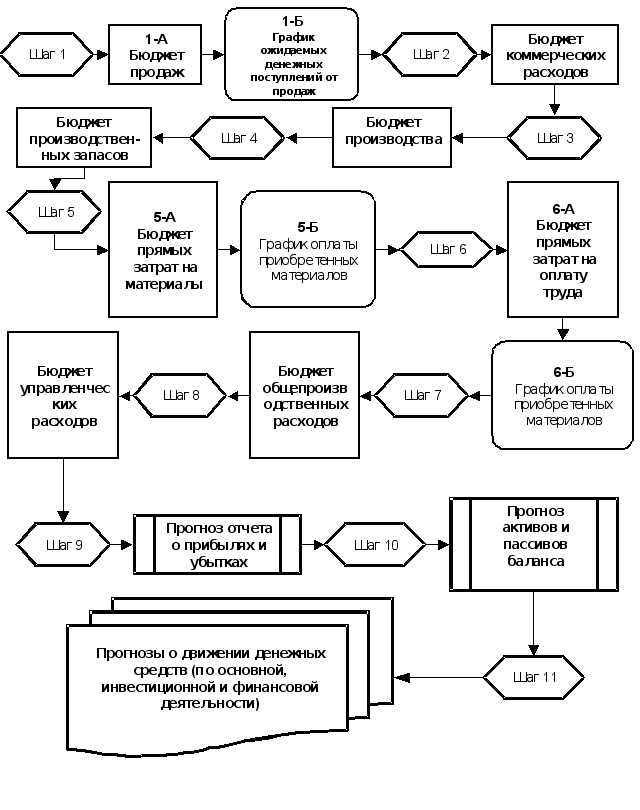 Рис. 3. Процесс формирования основного бюджета1 Реальные стандарты широко используются, так как они могут обслуживать одновременно много целей и обладают мотивационным влиянием на рабочих. На первоначальной стадии разработка стандартов и бюджетов входит в обязанности персонала, непосредственно связанного с производством продукции. При составлении бюджетов необходимо использовать документы, по форме и структуре приближенные к документам бухгалтерской (финансовой) отчетности, что значительно упрощает процесс бюджетирования. Программное обеспечение и современные компьютерные технологии позволяют значительно облегчить трудоемкий процесс бюджетирования и применять в расчетах и прогнозах комбинации экспертных, статистических методов и сценарный анализ по принципу: « что будет, если … ». Техника составления бюджета предусматривает 9-11 шагов, последовательность формирования бюджета определяется руководителем предприятия. Применительно к практике отечественных предприятий следует придерживаться схемы формирования бюджетов из одиннадцати последовательных шагов (см. рис. 4.).