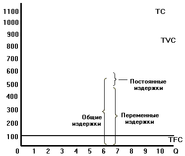 Рисунок 3.2 Общие издержки как сумма постоянных и переменных издержек 2 Сумма переменных издержек (TVC) изменяется в зависимости от изменения объема производства. Величина постоянных издержек не зависит от объема производства. Сумма общих издержек (ТС) производства любого количества продукции представляет собой результат суммирования соответствующих постоянных и переменных издержек. При производстве каждой дополнительной единицы продукции – с первой по десятую, и последующего объема производства – общая сумма издержек изменяется на ту же величину, что и сумма переменных издержек. На рисунке 3.2 данные о постоянных переменных и суммарных издержек, содержащиеся в таблице 3.1, представлены графически. Надо обратить внимание на то, что сумма переменных издержек изменяется по вертикали от горизонтальной оси, а сумма постоянных издержек каждый раз прибавляется к вертикальному измерению суммы переменных издержек для получения кривой общей суммы издержек. Различие между постоянными и переменными издержками имеет существенное значение для каждого бизнесмена. Переменные издержки – это издержки, которыми предприниматель может управлять. Величина переменных издержек может быть изменена в течении краткосрочного периода времени путем изменения объема производства. С другой стороны, постоянные издержки, очевидно, находится вне контроля администрации фирмы. Такие издержки являются обязательными и должны быть оплачены независимо от объема производства. Но существуют также и предельные издержки (МС), которые определяются дополнительным расходом ресурсов в случае изменения объёма выпуска продукции на одну единицу изделия. Расчет их производится путем деления данных колонки 4 (ТС) на количество произведенной продукции Q, колонка 1, таблица 3.1