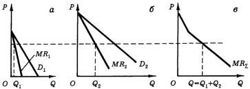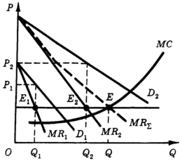 Только если никакое перераспределение объема реализации между сегментами рынка не позволит монополисту увеличить общую выручку, а следовательно, и прибыль. Условие (1) верно для распределения любого выпуска. Поскольку дополнительная единица товара, проданная на любом из сегментов рынка, приносит фирме одинаковую дополнительную выручку, равную предельной выручке на каждом из сегментов, предельная выручка фирмы на сегментированном рынке в целом также будет равна этой величине: