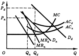 При дискриминации на сегментированном рынке монополия максимизирует прибыль, выбирая наилучшее сочетание цен и объемов продаж на каждом из сегментов, отличающихся один от другого эластичностью спроса. Предположим, что монополист может разделить рынок своей продукции на два сегмента, причем переток товара с одного сегмента на другой невозможен. Рис. 2,а отражает спрос на продукцию монополиста на сегменте с более эластичным, а рис. 2,б - на сегменте с менее эластичном спросом.