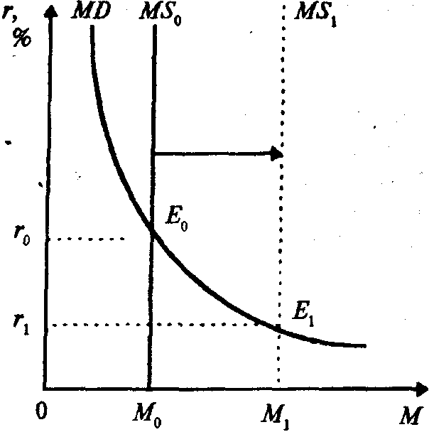 на рынке недостаток средств в обращении, то ЦБ проводит политику активной скупки правительственных ценных бумаг у населения. В результате увеличение спроса на них их рыночная цена возрастает, а процентная ставка падает. Что делает их непривлекательными для их владельцев. Держатели ценных бумаг начинают их активно продавать, в итоге банковские резервы увеличиваются, а затем и денежное предложение также увеличивается. График предложения денег в этом случае сдвинется вправо, а процентная ставка упадет.