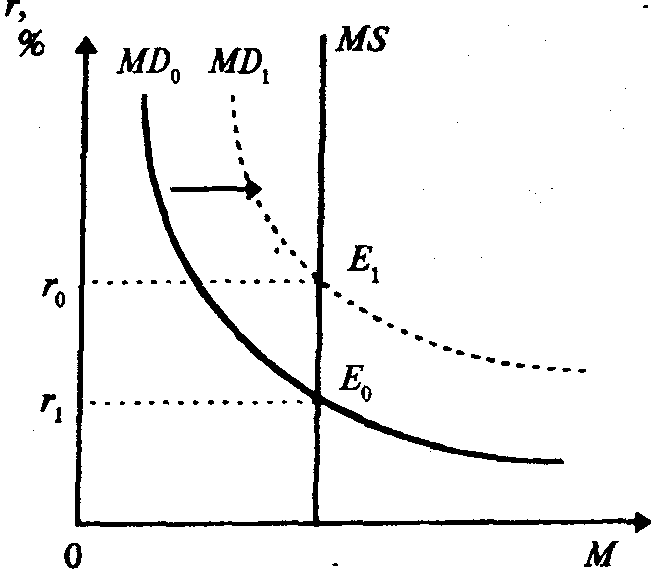 3. Денежный рынок имеет точку равновесия, находящуюся на пересечении кривых спроса и предложения и является равновесной ставкой процента. Равновесие на денежном рынке является подвижным.