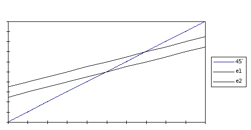Допустим, что процентная ставка равна нулю, и что абсолютный уровень цен перед началом первого периода снизился. Это значит, что реальная стоимость активов (денег, облигаций) в начале первого периода увеличивается. Это ведет к параллельному сдвигу бюджетной линии вправо, хотя доход в первом периоде не меняется. Устанавливается новое равновесие - E3, как показано на рисунке 3.