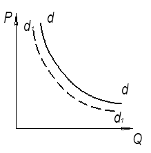 Рисунок 1. Спрос фирмы при несовершенной конкуренции. Это означает, что, когда фирма выбрасывает на рынок большое количество товара его цена падает, что отражено кривой dd. Такую фирму экономисты называют “несовершенным конкурентом”. Из этого отнюдь не следует, что у ее владельца плохой характер, что он бьет свою жену или не платит по счетам. Из этого не следует так же, что эта фирма не пытается победить своих соперников расширяя продажи или делая рекламу более эффективной. Острое торговое соперничество и “совершенная конкуренция” – это вовсе не одно и тоже. Фермер Джонс, например, вполне совершенный конкурент, но он совсем не рекламирует свой товар. Рекламе ему не нужна. Он может продать свою ХХоХХ??? и не окажет этом какого-либо на ее рыночную цену. Но “American Tobacco company”, производящая сигареты “Lucky Strike”, являясь не совершенным конкурентом, затрачивает массу энергии, пытаясь побить фирму, выпускающею сигареты “Chesterfield”, промышленность нюхательного табака, а быть может и кондитерскую промышленность. Поэтому окончательно подтвердить характер фирмы и дать ответ на вопрос, является ли она совершенным конкурентом, может лишь горизонтальность линии опроса. Для этого не имеет никакого значения, является ли фирма прибыльной или убыточной, располагает ли она патентами, особыми секретами производства, торговой маркой или другими преимуществами, дающими ей контроль над рыночной ценой. Фирма является “несовершенной” до тех пор, пока ее кривая спроса понижается и напоминает кривые спроса целых отраслей, а не горизонтальную линию спроса каждого мелкого совершенного конкуренты в отрасли с совершенной конкуренцией. (Это не означает, что фирма обладает абсолютным монопольным контролем над ценой, которую она в состоянии сама установить.) Монополия. На сколько несовершенной может быть несовершенная конкуренция? Крайним случаем вливается наличие единого продавца, обладающего практическим могуществом полного монополиста (слово “монополист” происходит от греческих слов “моно” – единственный и “полис” – продавец).В своей отрасли он является единственным производителем и не существует другой отрасли, выпускающей сколько-нибудь близкий заменитель его продукции. (На рисунке 1 изменение цены на продукцию любой другой фирмы не вызовет заметного смещения кривое монополиста – dd). Полные монополии, подобные тем, которые функционируют в коммунальном хозяйстве или в сфере телефонной связи, обычно находятся под государственным контролем, но даже и они должны учитывать потенциальную конкуренцию других товаров и услуг (например, нефть и газ или телеграф и телефон). Это свидетельствует об относительно небольшом значении полных монополий. Олигополия. Это грозно звучащее слово означает “немного продавцов” (происходит от греческого слова “олигос”, что означает “мало”, “немного”). Олигополисты бывают двух типов. Во-первых, олигополистом может быть один из немногих производителей, производящих идентичную продукцию. Так, если сталь, производимая фирмой А, ничем не отличается от стали производимой фирмой Б, тогда даже небольшая разница в цене отвлечет потребителей от фирмы А к фирме Б. Ни А ни Б нельзя назвать монополистом. И все же, если продавцов не много каждый может оказывать существенное воздействие на рыночную цену. Характерным приме