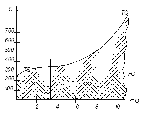 Постоянные издержки. В колонку 1 указаны различные уровни производства в единицу времени (от 0 до 10 единиц), в колонке 2 – Постоянные издержки фирмы в единице времени, которые равны 256руб., даже в том случае если фирма ничего не производит Постоянные издержки, как показывает само их название, являются постоянными; они составляются из прошлых обязательств, амортизационных отчислений, накладных расходов и т.п. Переменные издержки. Колонка 3 содержит оценки общей суммы Переменных издержек в единице времени при различных объемах производства. Согласно определению, когда продукция не выпускается, Переменные издержки равны 0. однако по мере роста выпускаемой продукции (Q) эти издержки изменяются. Сначала, с ростом производства, Переменные издержки растут очень быстро, но по мере дальнейшего увеличения продукции начинает сказываться фактор экономии на массовом производстве и рост Переменных издержек становится уже более медленным, чем расширение производства. В дальнейшем, однако, когда вступает в действие закон убывающей доходности, текущие Переменные издержки начинаю обгонять рост производства. Валовые издержки. Соответствующие данные показаны в колонке 4. Они являются ни чем иным, как суммой Постоянной Переменной издержек. Следовательно они существуют даже тогда, когда фирма не выпускает продукцию и в нашем случае равны 256руб. вместе с ростом Переменных издержек увеличиваются и Валовые издержки. На рисунке 3 эти 3 различные категории издержек представлены графически.