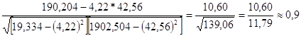 4.2.Рассчитайте линейный коэффициент корреляции. Используя t-критерий Стьюдента, проверьте значимость коэффициента корреляции. Сделайте вывод о тесноте связи между факторами х и у, используя шкалу Чеддока. таб.2