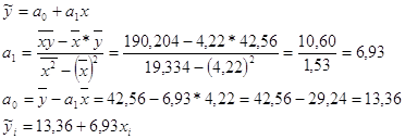 Вывод: по шкале Чеддока связь сильная. 4.2.2.Проверим статистическую значимость ЛКК по критерию Стьюдента: 1)Критерий Стьюдента: tвыб<=tкр 2)Но: r=0 tкр=2,31 tвыб=rвыб* Вывод: таким образом поскольку tвыб=5,84<tкр=2,31, то с доверительной вероятностью 90% нулевая гипотеза отвергается, это указывает на наличие сильной линейной связи. 4.3.Полагая, что связь между факторами х и у может быть описана линейной функцией, используя процедуру метода наименьших квадратов, запишите систему нормальных уравнений относительно коэффициентов линейного уравнения регрессии. Любым способом рассчитайте эти коэффициенты.