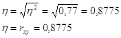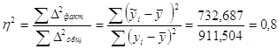 Вывод: т.е. 80% вариации объясняется фактором включенным в модель, а 20% не включенными в модель факторами. 4.8. Рассчитайте корреляционное отношение. Сравните полученное значение с величиной линейного коэффициента корреляции. Решение: