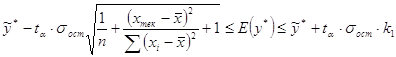 Для выполнения интервального прогноза рассматриваем две области. 1) для y из области изменения фактора x доверительные границы для линейного уравнения регрессии рассчитывается по формуле: 2)