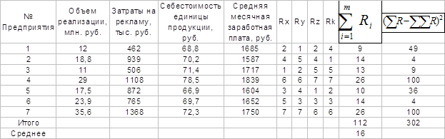 Задача 2. Имеются исходные данные о предприятиях отрасли. Используя коэффициент конкордации, оценить тесноту связи между приведёнными в таблице факторами. Табл.1