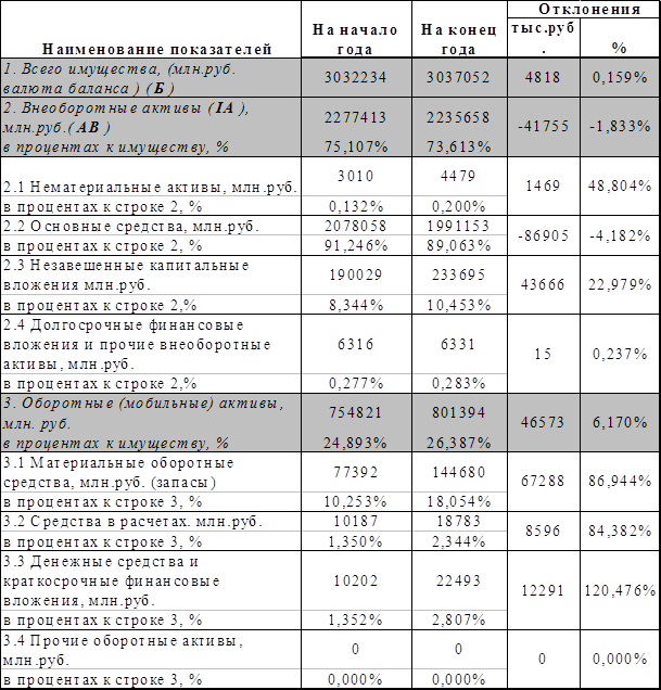 В таблице 1 по пунктам 1, 2, 3, 4 налог на добавленную стоимость начисляется дополнительно. Утвержденный тариф для городского населения ниже себестоимости в 1.6 раза, для сельского населения в 2.2 раза. Фактический уровень тарифов на электроэнергию для населения в 3.5 раза ниже себестоимости. Восполнение сниженной себестоимости идет за счет промышленных потребителей, но это вносит повышение в себестоимость производимой ими продукции, что естественным образом сказывается на общем повышении цен. Электроснабжение потребителей, подключенных к сетям Общества в соответствии с договорами - основное направление деятельности предприятия, приносящее ему существенную долю прибыли и значительно влияющее на его финансовое состояние. В связи с этим хочется привести некоторые цифры, характеризующие деятельность предприятия в 2000 году: · Потребление электроэнергии в крае составило 6450 млн.кВтч, полезный отпуск потребителям - 5420 млн.кВтч или 93,1% к 2000 году. · Среднеотпускной тариф составил 0,412 руб./кВтч ( 1,16 раза к 2000 году) и 0,324 тыс.руб./Гкал (1,23 раза к 2000 году). · По факту оплаты реализация составила 89,4%. 3. Оценка состояния и движения имущества предприятия АО "Ставропольэнерго" и источники его формирования Анализ финансово-хозяйственной деятельности по данным бухгалтерской отчетности может быть выполнен с различной степенью детализации. Основой анализа является система показателей и аналитических таблиц, логика отбора и составления которых предполагает анализ состояния и динамики экономического потенциала предприятия, результатов и эффективности его использования. Экономический потенциал хозяйствующего субъекта может быть охарактеризован двояко: c позиции имущественного положения предприятия и с позиции его финансового положения. Обе эти стороны финансово-хозяйственной деятельности взаимосвязаны - нерациональная структура имущества, его некачественный состав могут привести к ухудшению финансового положения и наоборот. Устойчивость финансового положения предприятия в значительной мере зависит от целесообразности и правильности вложения финансовых ресурсов в активы. Активы динамичны по своей природе. В процессе функционирования предприятия и величина активов и их структура претерпевают постоянные изменения. Наиболее общее представление об имевших место качественных изменениях в структуре средств и их источников, а также динамики этих изменений можно получить с помощью вертикального и горизонтального анализа отчетности. Понятие об имущественном положении предприятия, об имеющих место качественных изменениях в структуре средств и источников, а так же динамике этих изменений можно увидеть используя современную форму годового бухгалтерского баланса, не преобразуя его для этих целей , так как валюта баланса - нетто представляет собой чистое имущество предприятия. Данные для анализа состояния и движения хозяйственных средств (имущества) предприятия представлены в виде таблицы №2, для удобства и универсальности расчетов выполненной с помощью программного продукта Microsoft EXCEL (все таблицы дипломной работы выполнены также с помощью этого ПО), позволяющего подставлением исходных значений получать готовые результаты в итоговых графах таблицы с краткой характеристикой получаемых финансовых коэффициентов, что предоставляет в