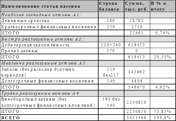 Как в видно из таблицы 3, основу источников имущества предприятия АО "Ставропольэнерго" составляют собственные средства. Их удельный вес в общей валюте баланса составил в начале года 88,9 процента (рисунки 3,4). Валюта баланса за анализируемый период возросла на 0,16 процент, что составляет 4 818 тыс. рублей и произошло это за счет увеличения заемных средств на 9,80 процентов в конце года в сравнении с началом года. Эта величина денежных средств составила 32 807 тыс. рублей. Удельный вес заемных средств в общем имуществе предприятия вырос с 11,04 процентов в начале года до 12,11 процентов в конце года. Наличие собственных оборотных средств возросло на 3,28 процентов за счет уменьшения внеоборотных активов к концу 1999 года (см. таблицу 2). Завершая анализ состояния и движения имущества предприятия АО "Cтавропольэнерго" хочется еще раз отметить, что несмотря на некоторые недостатки в структуре баланса, прослеживается тенденция здоровой экономической жизни и деятельности предприятия. Это подтверждают: 1. Увеличение стоимости имущества предприятия на 4 818 тыс. рублей или на 0,16 процента. 2. Увеличение производственных запасов на 67 288 тыс. рублей или на 86,9 процента. 3. Прирост собственных оборотных средств на 3,28 процента или на 13 766 тыс. рублей 4. Увеличение суммы незавершенных капитальных вложений на 43 666 тыс. рублей или 22,97 процента. 5. Увеличение краткосрочных финансовых вложений на 12 291 тыс. рублей или на 120,47 процента. 6. Отсутствие краткосрочных и долгосрочных займов, кроме кредиторской задолженности. К недостаткам в структуре имущества предприятия и источниках его формирования можно отнести: 1. Уменьшение величины основных средств на 86 905 тыс. рублей, что составляет 4,18 процента. 2. Незначительное, но уменьшение собственных средств на 27 989 тыс. рубля или на 1,04 процент 3. Увеличение дебиторской задолженности на 8 596 тыс. рублей или 84,38 процента. 4. Рост кредиторской задолженности на 33 913 тыс. рублей или 10,23 процента. 4. Оценка кредитоспособности и расчет показателей ликвидности активов предприятия АО"Ставропольэнерго" и ликвидности его баланса. Кредитоспособность - это способность предприятия своевременно и полностью рассчитаться по своим долгам. В ходе анализа кредитоспособности проведем расчеты по определению ликвидности активов предприятия АО"Ставропольэнерго" и ликвидности его баланса. Ликвидность активов - это величина, обратная времени, необходимого для превращения их в деньги. Ликвидность баланса выражается в степени покрытия обязательств предприятия его активами. Ликвидность баланса достигается установление равенства между обязательствами предприятия и его активами. Техническая сторона анализа ликвидности баланса заключается в сопоставлении средств по активу с обязательствами по пассиву. При чем активы должны быть сгруппированы по степени их ликвидности и расположены в порядке ее убывания, а обязательства - по срокам их погашения и расположены в порядке возрастания сроков уплаты. Группировку активов анализируемого предприятия по классам ликвидности целесообразно представить в форме таблицы 6, а группировку пассивов по степени срочности оплаты - в форме таблицы 7. Таблица 6.