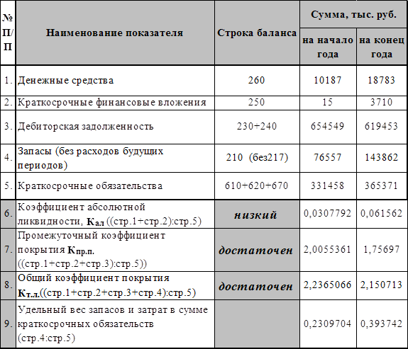 7. Баланс считается ликвидным при условии следующих соотношений групп активов и обязательств: А1 ³ П1 А2 ³ П2 А3 ³ П3 П4 ³ А4 Для значений, полученных в таблицах 6 и 7 имеем: А1 =22 493 ³ А1 = 365 371А2 =619 453 ³ П2 = 0 А3 = 148 670 ³ П3 = 0 П4 = 2 670 863 ³ А4 = 2 230 850 Для полной ликвидности баланса предприятия не выполняется первое соотношение, по этому его нельзя считать абсолютно ликвидным, но перспективная ликвидность, то есть прогнозируемая платежеспособность, достаточно высокая. Ликвидность предприятия определяется так же с помощью ряда коэффициентов. Они отражают готовность предприятия погасить краткосрочную задолженность своими средствами. При исчислении этих показателей за базу расчета принимают краткосрочные обязательства. Расчет показателей ликвидности анализируемого предприятия представим в виде электронной таблицы 8. Таблица 8.