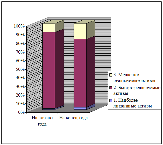 Рисунок 3.1. Структура оборотных средств предприятия АО"Ставропольэнерго по степени их ликвидности. По данным таблицы 3.6 можно заключить, что наименьшую часть оборотных средств предприятия АО"Ставропольэнерго" составляют наиболее ликвидные оборотные средства (см. рисунок 3.1). Их величина на конец года составила 22 493 тыс. руб., что на 12 291 тыс. руб. меньше этого показателя в начале года. Причиной этому послужило увеличение денежных средств на расчетном счете предприятия на 5 807 тыс. руб. В то же время значительный удельный вес в структуре оборотных средств приходится на быстрореализуемые активы (78,6%) и на медленнореализуемые активы (18,36%), они же претерпели увеличение к концу года: темп роста быстрореализуемых оборотных средств составил 94,65%, а темп роста медленнореализуемых оборотных средств составил 187,9%, что равняется 67 295 тыс. рублей. Ликвидность текущих активов является главным фактором, определяющим степень риска вложений капитала в оборотные средства. Накопленные оценки реализуемости тех или иных видов оборотных средств за длительный период времени позволяют определить вероятность риска вложений в эти активы. Но для предприятия энергетической отрасли характерен ряд факторов, которые были рассмотрены выше. Основная причина снижения доли высоколиквидных оборотных активов - это неплатежи дебиторов за отпущенную предприятием продукцию.