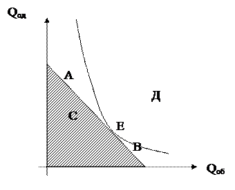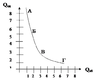 предельные полезности не равны, например, Потребительский выбор может быть объяснен с помощью карты кривых безразличия и линии бюджетных возможностей. Карта кривых безразличия демонстрирует предпочтения потребителя при выборе из двух товаров, а линия бюджетных возможностей – ценовые и бюджетные ограничения потребителя. Рассмотрим построение кривой безразличия и карты кривых безразличия на следующем примере. Допустим, что потребитель располагает таким доходом, при котором он может позволить себе приобрести набор, состоящий из одежды и обуви. Причем существует несколько наборов этих экономических благ, которые приносят ему одинаковую суммарную полезность: одежда обувь Набор А 8 единиц 1 единицаНабор Б 5 единиц 2 единицы Набор В 2 единицы 3 единицы Набор Г 1 единица 6 единиц С точки зрения суммарной полезности потребителю безразлично, какой из наборов выбрать. Если по одной оси откладывать количество одежды Qод, а по другой – количество обуви Qоб, то получатся точки, через которые можно провести кривую, называемую кривой безразличия.