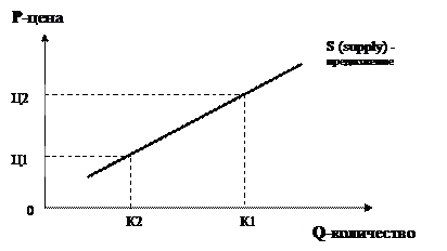 Рис.3. График предложения. Если цена окажется низкой, то продавцы предложат мало товаров, придержат часть его на складе. Если же цена будет высокой, то они предложат рынку много товаров. Когда же цена существенно возрастет и окажется очень высокой, то производители постараются увеличить предложение товара, попытаются сбыть даже бракованные изделия. Предложение отображается графиком (рис.3). Предложение, так же как и спрос, может меняться под влиянием неценовых факторов: а) изменения издержек производства в результате технических нововведений, изменения источников ресурсов, налоговой политики, стоимости факторов производства. Повышение издержек сдвинет кривую предложения влево, снижение – вправо; б) выхода на рынок новых фирм, что увеличит предложение вне зависимости от цен; в) изменение цен на другие товары, приводящего к переливу ресурсов (уходу фирм из отрасли), что уменьшит предложение; г) природных катастроф, политических действий, войн, разрушающих экономику, что вызовет сокращение предложения. 1.7. Цена.