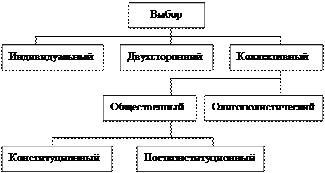 Выбор всегда персонален, это определено биологически. Люди не могут «сливаться» в процессе выбора в некое единое существо. Никакой социальный организм не имеет центра принятия решений, находящегося «вне» индивидов. Логика коллективной организации может быть сведена к логике индивидуального расчета. Однако, различают три типа выбора: индивидуальный, двухсторонний и коллективный. (рис.5) Рис.5 Классификация видов выбора. Индивидуальный выбор имеет место, когда человек сам принимает решения и сам их реализует, не взаимодействуя при этом с другими людьми. Наиболее распространен второй тип выбора – двухсторонний, - когда требуется согласование предпочтений двух индивидов. Воспользуемся примером Джеймса Бьюкенена – покупка арбуза у предорожного лотка. Прохожему нравится арбуз, добровольно предлагаемый ему продавцом, и он покупает его. Выбор сделан и тем и другим. Они вступили в сделку и осуществили её «без детального знания поличтических убеждений, сексуальных предпочтений или экономического положения своих реальных партнеров по обмену… В этом классическом смысле рыночный обмен полностью обезличен и кажется совершенно идеальным типом взаимодействия, воплощенным в упорядоченной анархии. В таких отношениях каждый человек приниматся именно таким, какой он есть, и очень часто таким, каким он хочет выглядеть. Торговец фруктами с лотка может бить свою лошадь, отстреливать собак и есть крыс. Но ни одна из черт его характера не должна влиять на мой чисто экономический обмен с ним». [ 3 стр. 10] Двухсторонний выбор имеет место, Когда для принятия решения и его реализации требуется согласование предпочтений двух индивидов. Коллективный выбор имеет место, когда решения принимаются и реализуются индивидами в составе группы. Индивид всегда преследует свой «интерес», хотя, конечно, каждый понимает его по-разному. Но нет никаких оснований полагать, что индивид, действуя в составе коллектива, руководствуется исключительно общественным долгом, ставя перед собой вневременные, внеситуационные нравственные задачи, которые становятся для него внутренним обязательством. В свою очередь коллективный выбор делится на: «олигополистический» (в которой участники взаимозависимы, т.е. поведение одного оказывает значительное влияние на поведение остальных) и «латентный» (в которой действие одного участника не отражается на других в такой степени, чтобы у них появились какие-либо причины реагировать на это действие). Общественный выбор имеет место, когда решения принимаются и реализуются индивидами в составе латентной группы. Но чтобы принимать решения, группа должна договорится, как делать выбор и как обеспечивать его реализацию. Общественный выбор правил выбора, правил «игры» был назван конституционным, общественный выбор в процессе «игры» - постконституционным. Конституционный выбор – общественный выбор правил выбора. Альтернативную стоимость можно определить как ценность наилучшей из истраченных возможностей в использовании данных ресурсов. 2.1. Издержки производителя как стоимость альтернативы.В экономической науке нет существенных различий между теорией предложения и теорией спроса. И та и другая предполагают, что лица, принимающие решения, могут выбирать, что выбор предполагает наличие альтернатив и что выбор основывается на с
