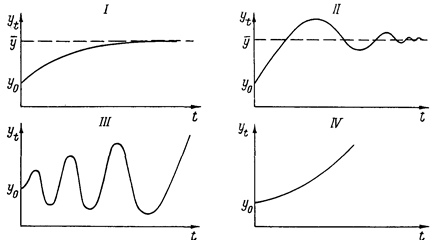 Рис. 2. Варианты динамики национального дохода при взаимодействии мультипликатора и акселератора. Если значения МРС и акселератора указывают на область I, то после нарушения равновесия в результате изменения автономного спроса график (национальный доход) монотонно устремится к новому равновесному уровню. При значениях МРС и акселератора, находящихся в области II, национальный доход достигнет нового равновесного уровня, пройдя через затухающие колебания. Когда сочетания значений МРС, акселератора указывают на область III, тогда динамика национального дохода приобретает характер взрывных колебаний Комбинации значений МРС и акселератора из области IV приводят к тому, что после нарушения равновесия график монотонно устремляется в бесконечность. И наконец, если акселератор равен единице, то при любом значении предельной склонности к потреблению в случае нарушения равновесия возникают равномерные незатухающие колебания национального дохода. Реальной экономике соответствуют области III и IV, так как МРС < 1, а акселератор > 1. При таком сочетании значений МРС и акселератора равновесие не устойчиво, и при его нарушении в модели национальный доход принимает неправдоподобные значения. В действительности размер национального дохода не может существенно превышать величину национального дохода полной занятости. Это ограничивает амплитуду колебаний объема национального дохода сверху. Глава 3. Структурные изменения в экономическом развитии. 3.1. Сущность экономической структуры. Согласно Литтре, структура означает "способ упорядочения организованных единиц, состоящих из многочисленных и различных по своей природе элементарных частей". По мнению же Лаланда, структура может пониматься в двух смыслах: 1. Расположение частей, образующее единое целое, в отличие от функций этих частей (анатомия и физиология). 2. В специальном и новом смысле — в отличие от простой комбинации элементов - единое целое, образованное из солидарных между собой феноменов, так что каждый из них зависит от других и может быть тем, чем он является, лишь в своем отношении и посредством отношения с этими другими. Второй смысл особо подчеркивается знаменитой немецкой теорией "гештальтов" (Gestalt Théorie), то есть теорией формы; последняя заключается в том, что феномены рассматриваются как некие совокупности, образующие автономные единицы, которые проявляют внутреннюю солидарность и подчиняются своим собственным законам. Следовательно каждый элемент зависит "от структуры совокупности и законов, ею управляющих". Теперь мы понимаем, что с одной стороны, это идея разнородности единиц, составляющих целое; с другой стороны, идея взаимозависимости и интеграции этих элементов, которые не приобретают смысла иначе, как один посредством другого. Понятие "структура" мы можем встретить всюду: физика, к примеру, изучает структуру материи; биология - структуру живого мира и живых организмов; математический анализ, в недавних разработках его, о которых можно прочитать в книге Н. Бурбаки "Математические элементы" определяет типы структур; К. Леви-Стросс назвал один из своих трудов "Элементарные структуры родства". Для уяснения понятия структуры, необходимо процитировать Мерло-Понти: "Надо признать идею, что для каждого индивида существует общая структура поведения, которая находит выр