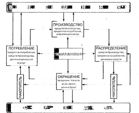 Рис. 1. Общая схема воспроизводства Вслед за производством (созданием, выпуском) экономического продукта следует его распределение по направлениям дальнейшего движения или использования, то есть своего рола разделение и адресация продукта. Отметим, что производство создает продукт в его натуральном выражении, тогда как на стадии распределения может происходить как распределение собственно продукта в натуральной форме, так и его стоимости в денежной форме посредством системы денежных расчетов с участниками производства, владельцами израсходованных в процессе производства ресурсов. Так что уже в ходе производства первичный материально-вещественный, ресурсный поток как бы разделяется на движение преобразуемых ресурсов и связанное с ним, обусловленное им движение стоимости, денег. В результате распределения происходит дальнейшее продвижение продукта к потребителю, при этом часть его может осаждаться в накопителе » виде резерва, запасов, подлежащих последующему распределению. И что еще более важно, процесс распределения может быть и очень часто бывает многократным, в особенности когда распределяются денежные средства. Иначе говоря, наблюдается первичное, а затем вторичное и последующие распределения как промежуточного и конечного продукта, так и в еще большей мере – денежного результата, которые правомерно называть псрераспредслсниями. Перераспределительные процессы весьма характерны для современной экономики, вследствие чего зачастую трудно определить, кто же стал потребителем произведенного продукта, конечным обладателем его денежной стоимости, первоначально распределенной между владельцами факторов производства. Например, работник, получивший деньги за свой труд, может отдать часть их своему сыну, который купит на эти деньги цветы любимой девушке, в результате чего произойдет не только распределение, но и перераспределение денежных средств. Пройдя стадию распределения, экономический продукт, которому предназначено стать товаром, подвергается обмену, купле-продаже на рынке. При этом пол обменом понимается как обмен на деньги, так и натуральный обмен в форме бартера. Имеет место операция «товар–деньги» или «товар–товар», в которой и заключена суть обмена, вступает в действие рыночный и сопутствующий ему ценовой механизм. Продукт превращается в товар. Обмен товара на деньги, порождаемый движением товара от производителя (продавца) к потребителю (покупателю), сопровождается, естественно, встречным потоком денежных средств от покупателя к продавцу товара в виде оплаты купленного товара. Это движение денег не указано на схеме, так как на ней отображены материально-вещественные потоки, а движение денежных средств затронуто только вскользь. За обменом следует потребление товара в форме конечного потребления потребительских товаров, предметов потребления, выбывающих из цикла, завершающих свой воспроизводственный цикл на его последней стадии. Такое завершение происходит либо в форме конечного потребления товара потребителем, либо и виде производственного потребления, когда товар, продукт вновь попадает в производство, но уже в своем новом «товарном» качестве, в виде ресурса. Вне зависимости от того. какова судьба потребляемого товара, стадия производства начинается вновь и вновь, чтобы воспроизв