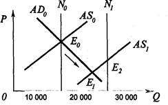 Рис. 2 Предположим, что экономическая система первоначально находится в состоянии равновесия в точке Е0 Затем уровень естественного реального объема производства поднимается с 15 000 до 25 000 денежных единиц. Это представлено на рис. 2 сдвигом кривой совокупного предложения на долгосрочном временном интервале из положения N0 в положение N1. Кривая краткосрочного совокупного предложения также сдвинется и займет положение AS1. Допустим, что совокупный спрос при этом не изменится (например, в силу проведения жесткой денежно-кредитной, налоговой и бюджетной политики государства), т. е. кривая совокупного спроса останется в положении AD0 Что будет в этом случае происходить с экономической системой? Прежде всего произойдет незапланированное увеличение товарно-материальных запасов у производителей. Следовательно, предприниматели не смогут полностью реализовать увеличивающийся объем производства по тем ценам, которые сложились прежде. Чтобы избежать накопления запасов нереализованной продукции, они вынуждены будут снижать уровень цен, надеясь таким образом стимулировать сбыт. В то же время они будут изменять свои производственные планы, несколько сокращая объем производства, перемещаясь из точки Е2 в Е1 вдоль кривой краткосрочного совокупного предложения AS1. В ответ на это потребители будут перемещать объем своих покупок вдоль кривой совокупного спроса из Е0 в Е1. В итоге установится равновесие при неполной занятости, уровень безработицы возрастет, а экономика не сможет реализовать имеющийся потенциал экономического роста. Опыт стран с развитой рыночной экономикой показывает, что сохранение неизменного уровня безработицы в долгосрочном периоде возможно лишь при ежегодном расширении реального объема национального производства на 2,5-3 %. В противном случае доля безработных в составе самодеятельного населения имеет тенденцию к увеличению, а рост реального объема производства и реальной заработной платы работающих, как правило, сопровождается снижением реальных средне-душевых доходов населения страны. К факторам распределения, оказывающим воздействие на экономический рост, относятся: • фактическая аллокация производственных ресурсов по отраслям, предприятиям и регионам страны; • действующий в обществе порядок распределения доходов между субъектами хозяйственной деятельности. Эти факторы влияют как на способность экономической системы к росту, так и на ее эффективность. Способность к наращиванию производства, создаваемая прямыми факторами предложения, недостаточна для расширения реального объема производства темпами, соответствующими потенциальным возможностям роста. Необходимо такое распределение ресурсов, которое позволяет их эффективно использовать с целью получения максимального количества полезной продукции. Эта проблема решается в своей основной части рынком, а в тех сферах, где рынок терпит фиаско, – государством (производство общественных благ, нейтрализация негативных внешних эффектов). Порядок распределения доходов также имеет важное значение для реализации потенциала экономического роста. Эту функцию он выполняет только в том случае, если стимулирует рабочих к повышению производительности труда. Иными словами, для роста экономики потенциально возможными темпами необходимо, чтобы доходы соб