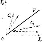 Рис. 4 Рис. 5 Все реальные траектории системы, отмеченные на. рис. 4, сходятся (по направлению стрелок) к траектории долгосрочного равновесия OF. Это означает, что даже при исходном довольно существенном отклонении экономической системы от состояния долгосрочного равновесия (точки А1, А2) выпуски продукции двух секторов постепенно приближаются к состоянию долгосрочного равновесия (точки близкой сходимости F1,F2 Таким образом, данная система имеет траекторию устойчивого долгосрочного равновесия. Напротив, для системы, изображенной на рис. 18.5, характерно неустойчивое равновесие, поскольку, начиная движение из любой точки, не расположенной непосредственно на луче OF, эта система при движении по любой реальной траектории, обозначенной стрелками, будет постепенно удаляться от траектории равновесия. Модели равновесного роста предназначены для изучения свойств равновесных траекторий (их устойчивости или неустойчивости), а также для определения условий, возвращающих экономическую систему на равновесную траекторию в случае отклонения. Эти модели следует отличать от моделей роста, ориентированных на прогноз вероятных тенденций изменения реальных экономических систем. Простая неоклассическая модель роста. Неоклассические модели роста используются для изучения трендовых траекторий при стационарном режиме развития, предполагающем, что макроэкономическое статическое равновесие в условиях совершенной конкуренции и процессе роста как бы воспроизводит самое себя. Базовые переменные модели изменяются одинаковыми темпами, а взаимосвязь между ними во всех временных точках рассматриваемого периода постоянна. По сути дела речь идет о «динамической статике»: характер развития в будущем полностью аналогичен его состоянию в настоящем. Таким образом, в динамике равновесие поддерживается так же, как и в статике: на основе точного знания производителями цен равновесия на свой продукт, гибких цен на продукты и ресурсы, немедленного уравнивания сбережений и инвестиций с помощью гибких процентных ставок, расширения доходов пропорционально предельной производительности факторов производства, максимизирующего поведение всех производителей. 2.5.. Концепции стадий экономического ростаКак отмечалось ранее (см. 18.1), проблемы роста в экономической теории рассматриваются применительно не только к долгосрочному, но и «сверхдлинному» периоду. Особое место среди этих теорий занимают концепции стадий экономического роста, рассматривающие экономическую динамику с точки зрения глобальной исторической перспективы качественной эволюции общества. Основной целью этих концепций является выделение фундаментальных различий, которые показывают специфику функционирования общества на каждой из стадий (этапов) его развития. В экономической теории существуют две основные концепции деления общества на стадии роста. Формационная теория, разработанная К. Марксом и его последователями. Суть этой теории кратко может быть сведена к следующему: производительные силы, существующие на определенном этапе развития, и производственные отношения общества находятся в единстве и взаимодействии. Это единство выражается понятием «способ производства». В свою очередь производственные отношения выступают как базис (основа) для действующих институтов полити