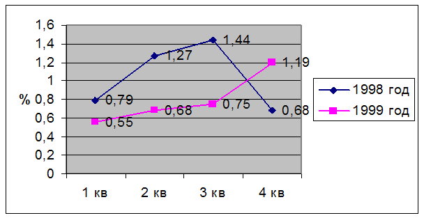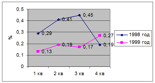 Рисунок 2.2 – Брак по стали за 1999 г. в сравнении с 1998г.
