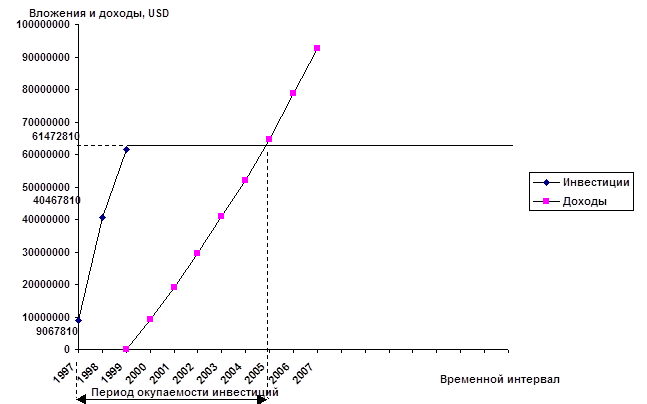 где Ki - инвестиционные вложения в проект в i-м временном интервале; Дi - доход предпринимателя от эксплуатации объекта в i-м временном интервале; t - количество временных интервалов функционирования проекта, за которое суммарные инвестиции сравниваются с суммой доходов от эксплуатации нового дела (это и будет искомый срок окупаемости инвестиций). Для определения срока окупаемости инвестиций в рассматриваемом нами проекте воспользуемся приведенными в таблице 3.1 данными и подставим их в формулу (3.6). В результате получим число приближенное к 8,75. Это значит, что период окупаемости проекта наступит с 8,75 временного интервала, что в пересчете составляет 8 лет и 9 месяцев. Для большей наглядности отобразим графически срок окупаемости предложенного нами проекта. На рисунке 3.1 по горизонтальной оси откладывается текущее время в кварталах. По вертикальной оси нарастающим итогом откладываются инвестиционные вложения и получаемые доходы в USD. Точка пересечения двух приведенных кривых (инвестиций и доходов) определяет срок окупаемости инвестиций. Рисунок 3.1 - Определение срока окупаемости инвестиций