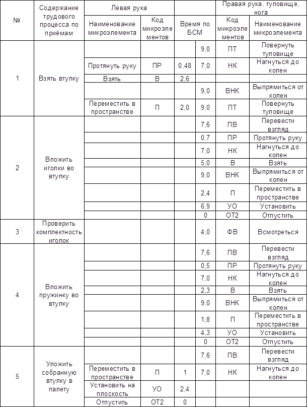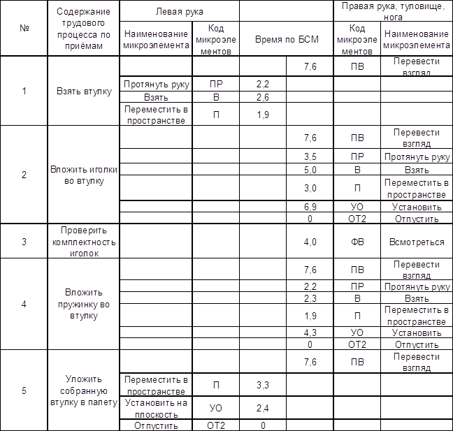 Содержание трудового процесса: 1. Взять втулку. 2. Вложить иголки во втулку (20 шт.). 3. Проверить комплектность иголок. 4. Вложить пружинку во втулку. 5. Уложить собранную втулку в палету. 2.1 На основе исходных данных производится расчленение приёмов на трудовые движения (микроэлементы) и определяется продолжительность трудового процесса при существующей системе организации рабочего места. Полученные данные записываются в таблицу 2.2. Таблица 2.2 Метод выполнения операции (существующий)