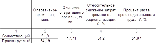 tоп пр = 570*60/1000 = 34,19 мин. 2.3 Сравнение проектируемого процесса с существующим осуществляется в таблице 2.4. Экономия оперативного времени определяется по формуле: tэ = tоп с - tоп пр, мин., (2.1) где tоп с, tоп пр – оперативное время выполнения операции при существующей и спроектированной организации трудового процесса. tэ = 51,9-34,19 = 17,71 мин. Относительное снижение затрат времени выполнения операции после рационализации трудового процесса (Х) определяется следующим образом: Х = tэ / tоп с*100 (2.2) Х = 17,71/51,9*100 = 34,2 А процент роста производительности труда (У) определяется: У = 100*Х/(100-Х) (2.3) У = 100*34,2/(100-34,2) = 51,87% Таблица 2.4 Снижение затрат времени